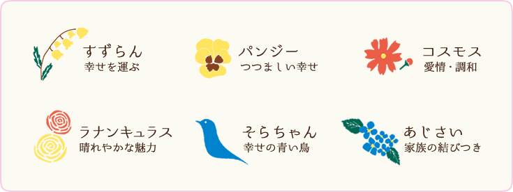 ロゴマークには幸せな花言葉をもつ花をちりばめ、少しでも心が楽しくなるように。